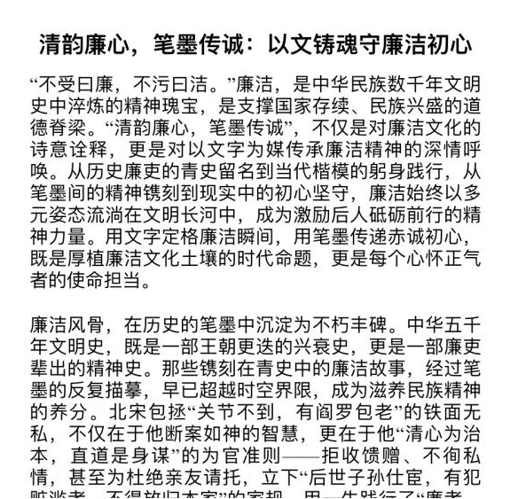 围绕“身边的廉洁故事”、“廉洁与成长” 等主题,向学生群体征集自己对廉洁的认知和感悟心得。征文活动吸引了100余名同学的参加,投稿作品中,有记录不同时代背景下家族三代对廉洁坚守的真实经历,有探讨古往今来如何筑牢廉洁思想防线的深刻思考,字里行间饱含对廉洁精神的尊崇。评审组从思想性、文学性等维度筛选,最终评选出一等奖2名,二等奖4名,三等奖6名。