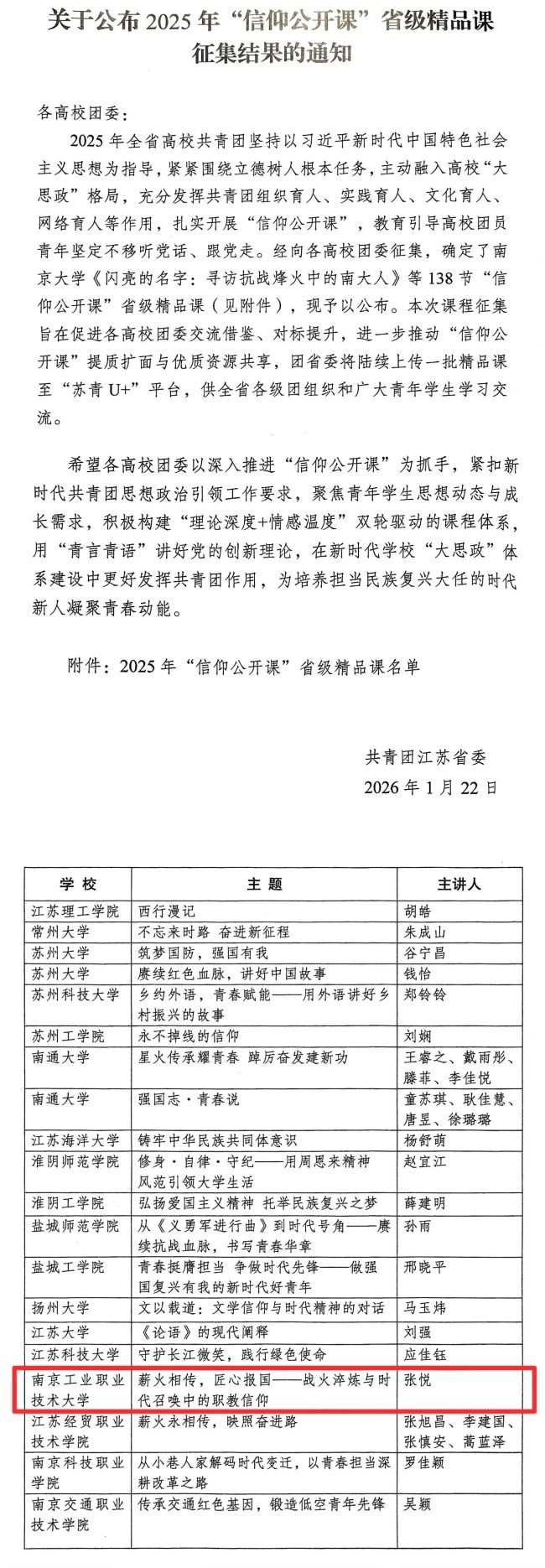 近日,共青团江苏省委正式发布了《关于公布2025年“信仰公开课”省级精品课征集结果的通知》,经高校推荐、团省委评选,在全省范围内共评选出138门“信仰公开课”入选“省级精品课”,由电子信息工程学院/集成电路学院选送的《薪火相传,匠心报国——战火淬炼与时代召唤中的职教信仰》成功获评“省级精品课”。